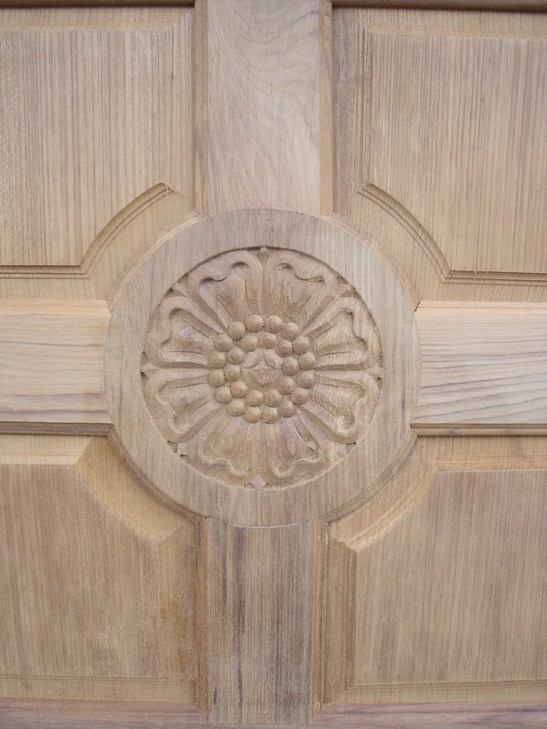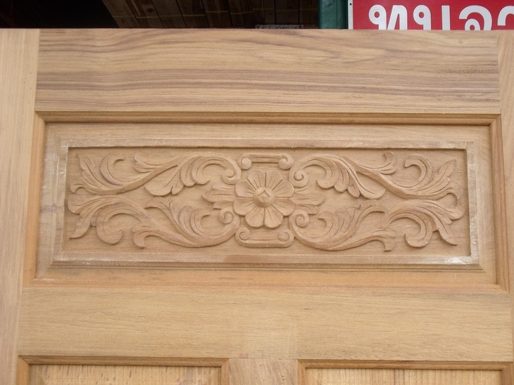 ผลิตจากไม้สักเกรดA คือไม่มีตา รูมอด แต่สีไม้จะไม่เหมือนกันทั้งบาน เนื่องจากไม้ที่นำมาผลิตไม่ได้นำมาจากไม้ต้นเดียวกัน บริเวณลูกฟักและลายแกะนั้นผลิตจากไม้ชิ้นเดียวไม่รอยต่อ บานหนา35มิลผลิตได้ตามขนาดที่ลูกค้าต้องการ