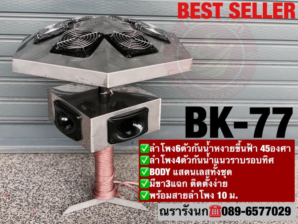อีเมลล์: swiftletthailandshop@gmail.comBK-77 ลำโพงเรียกนกรอบทิศทาง จำนวน 2 ชั้น ชั้นบนลำโพงกันน้ำแหงนขึ้นฟ้า 45 องศา ถึง 6 ตัว และชั้นล่างอีก 4 ตัวในแนวระนาบ ทำจากแสตนเลสทั้งชุด มีจุดยึดติดตั้งง่าย มาพร้อมสายลำโพง 10ม เรียกทั้งด้านบนและรอบๆ ครบทุกทิศทาง กันน้ำ กันฝน ติดตั้งบริเวณยอดตึก หลังคาบ้าน เพื่อดึงนกทุกทิศทาง ทนทาน คุ้มค่า