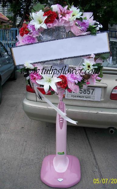 หรีดพัดลมตั้งโต๊ะ หน้ากว้าง 16 นิ้ว ของฮาตาริ(ดอกไม้สด สามารถปรับเปลียนสีได้ตามต้องการ)