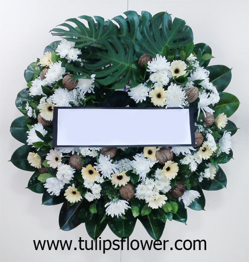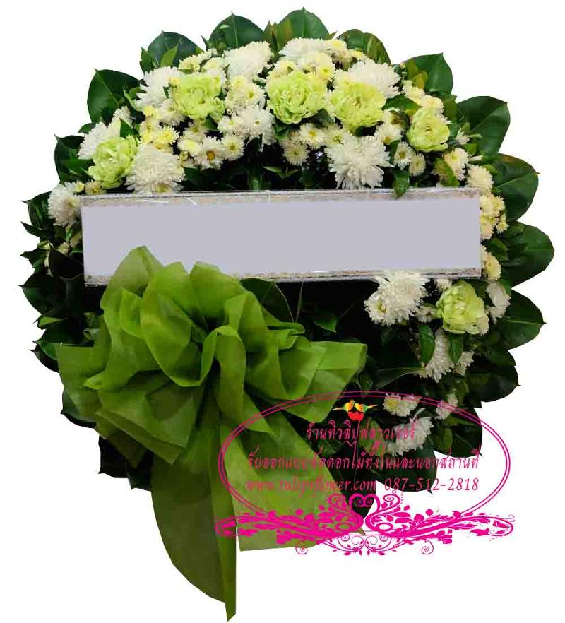 พวงหรีดดอกไม้สด โทนสีขาว เขียว เหลือง ขนาดกว้างประมาณ 35-38 นิ้ว